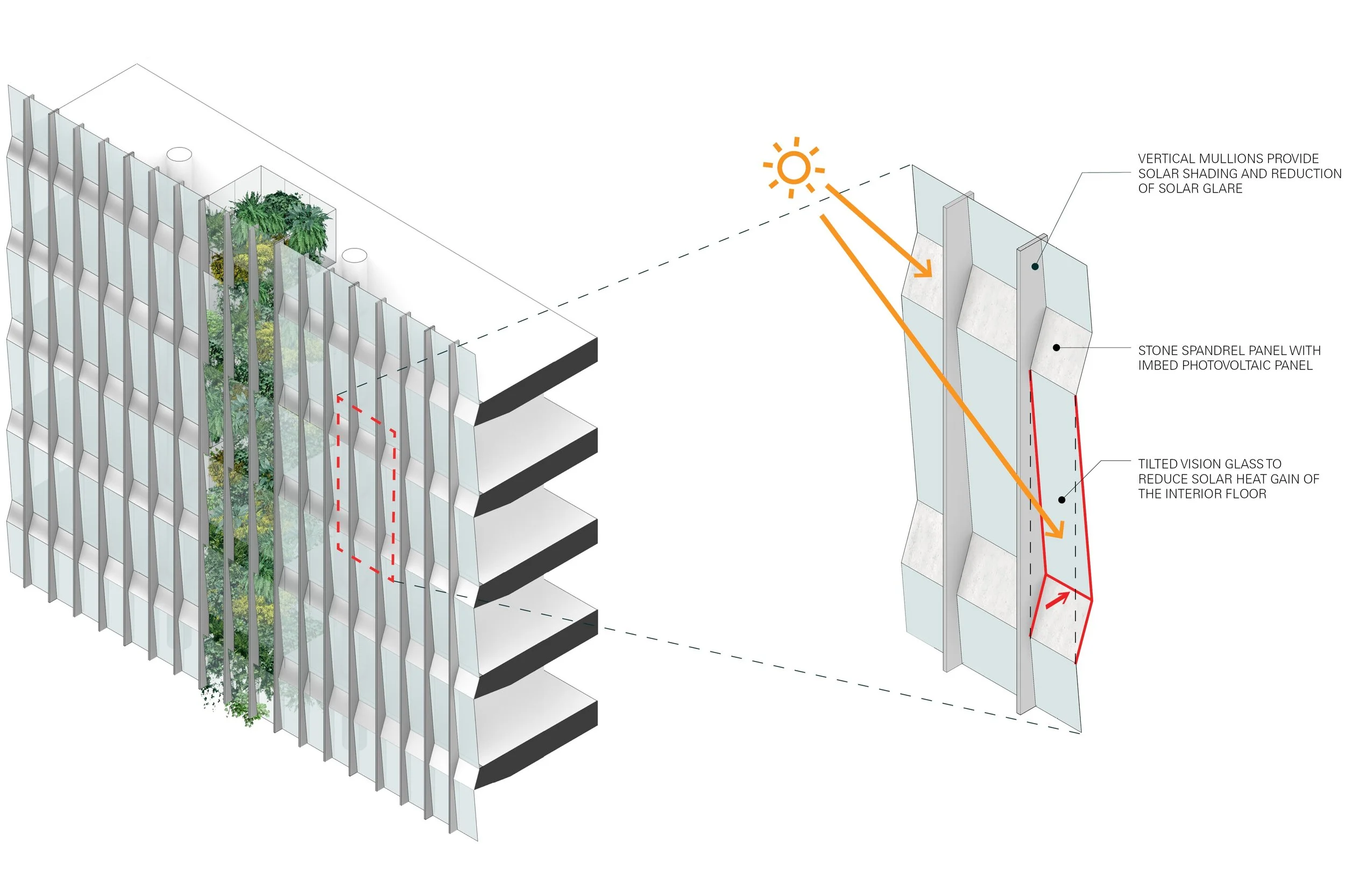 The site is organized around a central passage connecting the urban area to the central park, flanked by interactive gardens. The building’s expressive entry focuses on art and culture, leading to a raised lobby surrounded by rooftop gardens. This design creates a seamless flow of people and energy, blending nature with the building’s technological function.